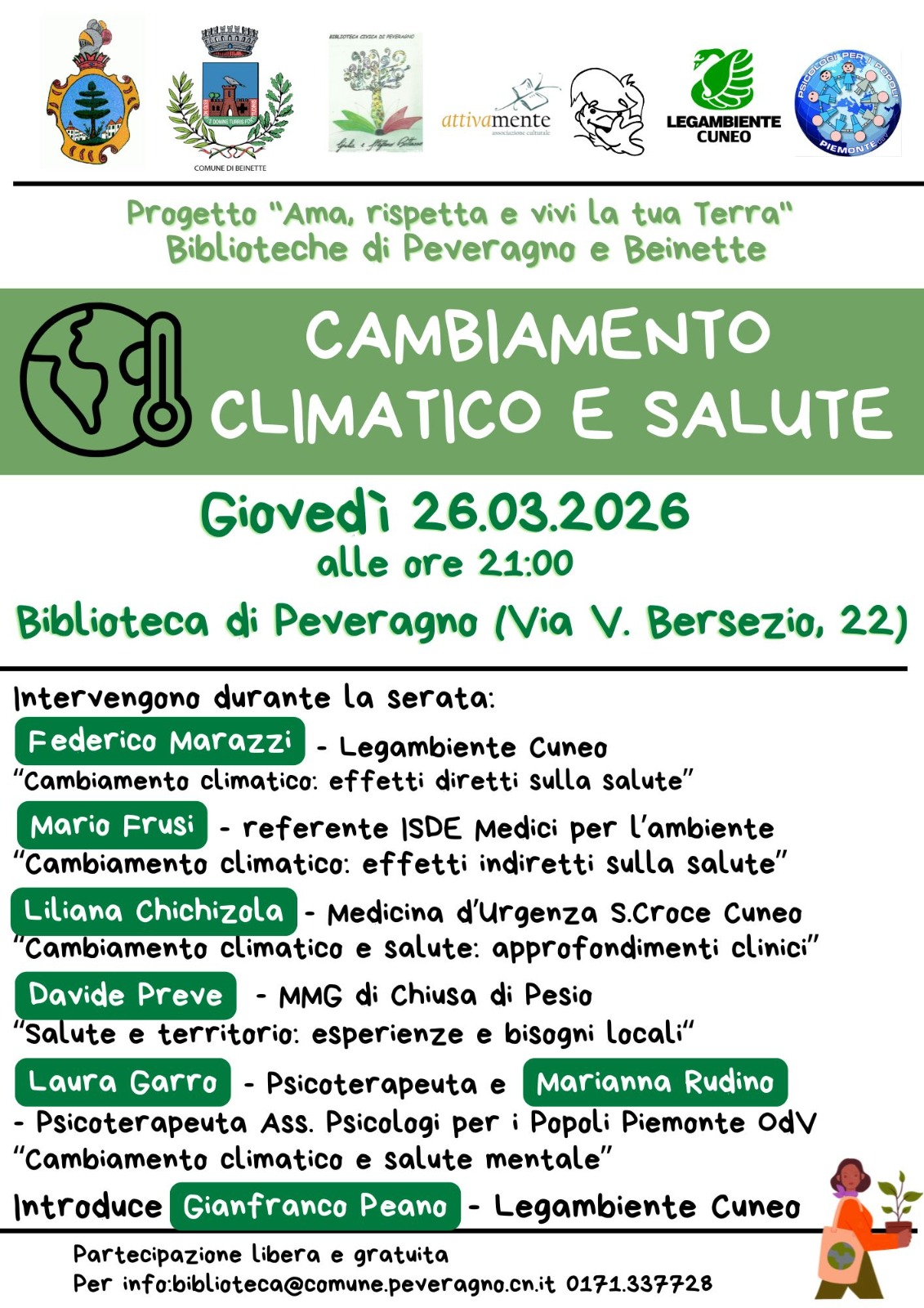 interessante evento informativo intitolato "Cambiamento Climatico e Salute", che si terrà nell'ambito del progetto "Ama, rispetta e vivi la tua Terra" promosso dalle Biblioteche di Peveragno e Beinette.