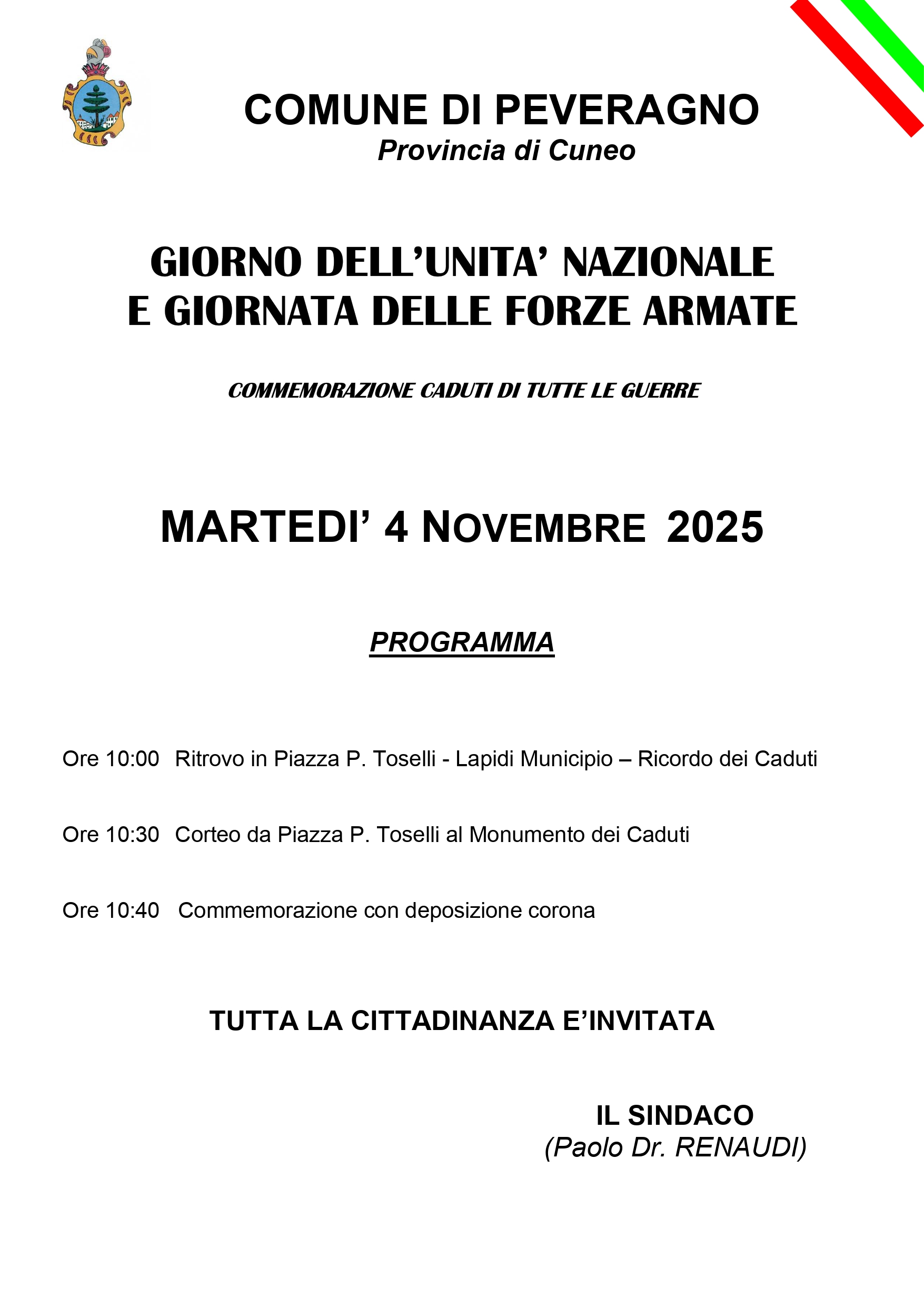 - Ore 10.00: Ritrovo in Piazza Pietro Toselli - Lapidi Municipio - Ricordo dei Caduti- Interventi degli alunni della Scuola Secondaria di Peveragno