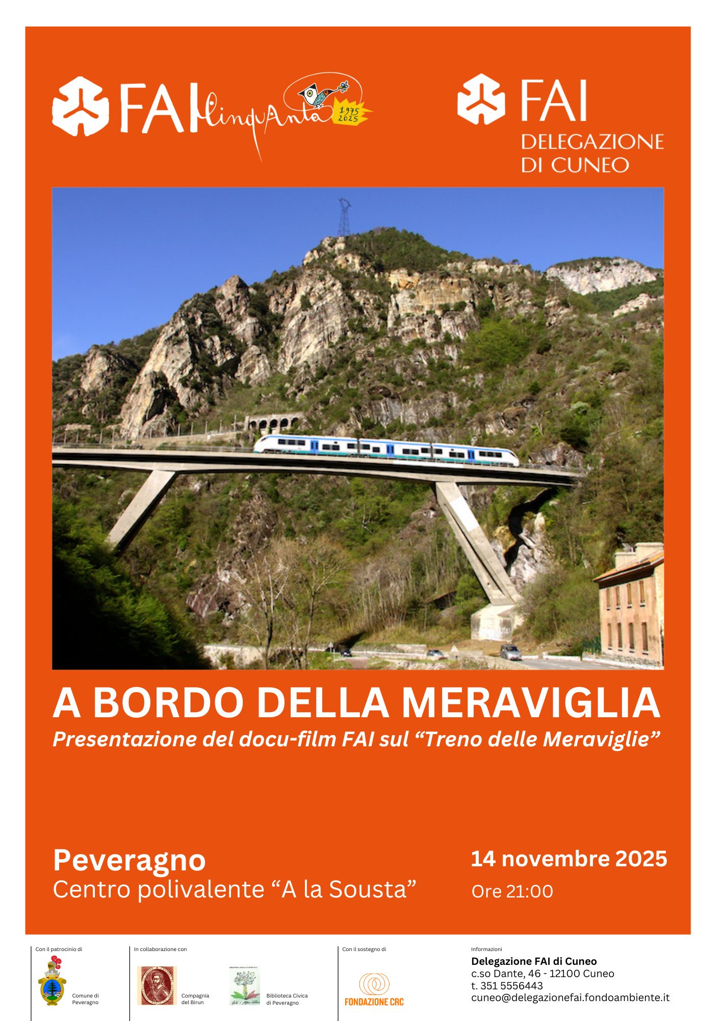 C'è un'Italia segreta che scorre via dai finestrini di un treno, un patrimonio di bellezza e ingegneria che aspetta solo di essere rivelato. Il docu-film "A bordo della Meraviglia", l'opera che ha dato voce e volto alla Ferrovia Cuneo-Ventimiglia-Nizza – acclamata come "Luogo del Cuore" FAI nel 2020 – arriva a Peveragno per un'emozionante serata di viaggio, meraviglia e scoperta.