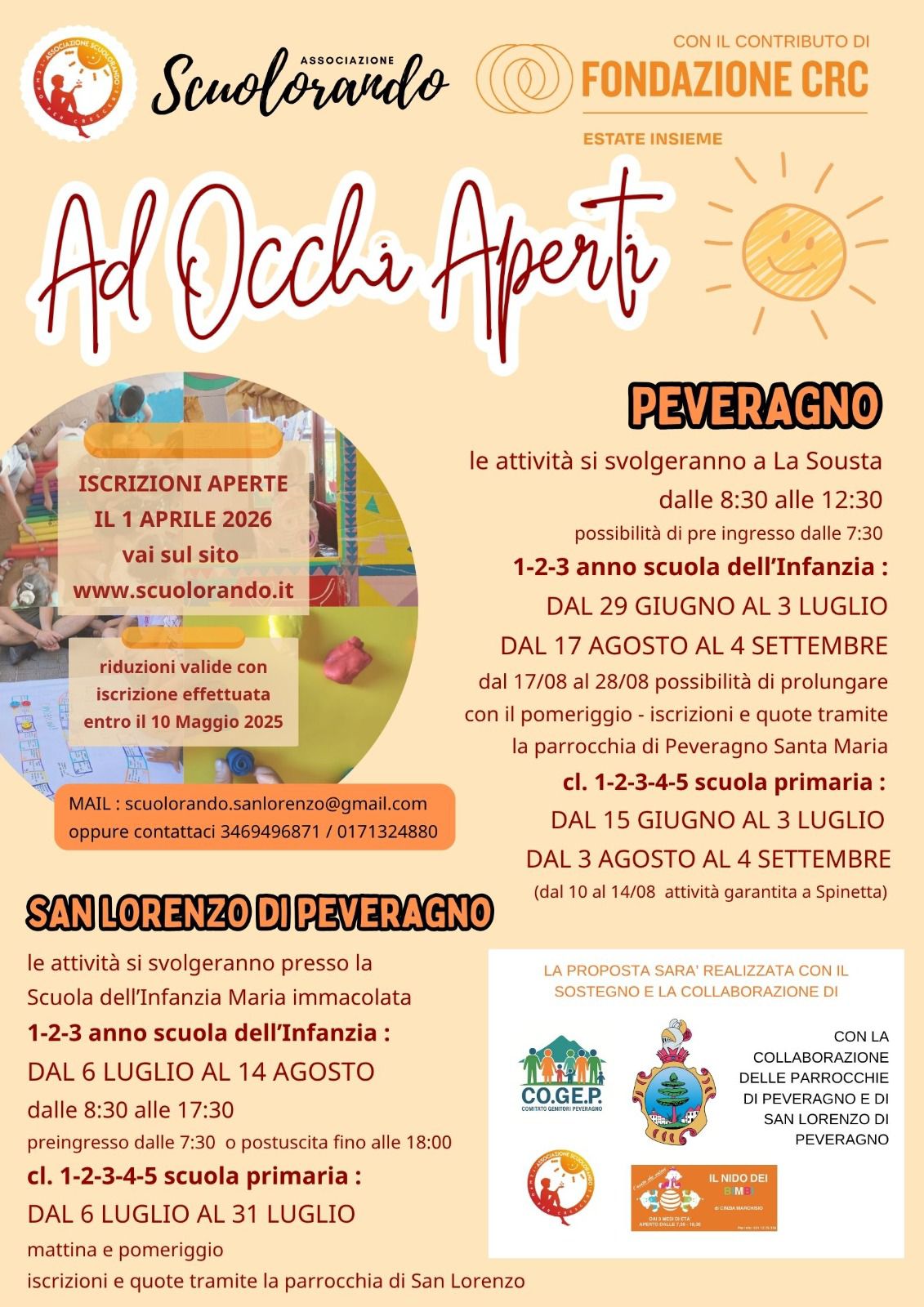 Estate 2026 per i bimbi e ragazzi residenti a Peveragno, organizzato da Scuolorando con il supporto del COmitato GEnitori Peveragno, Il Nido dei Bimbi, con la collaborazione delle Parrocchie di Peveragno e di San Lorenzo e con il contributo della Fondazione CRC, Bando Estate Insieme.